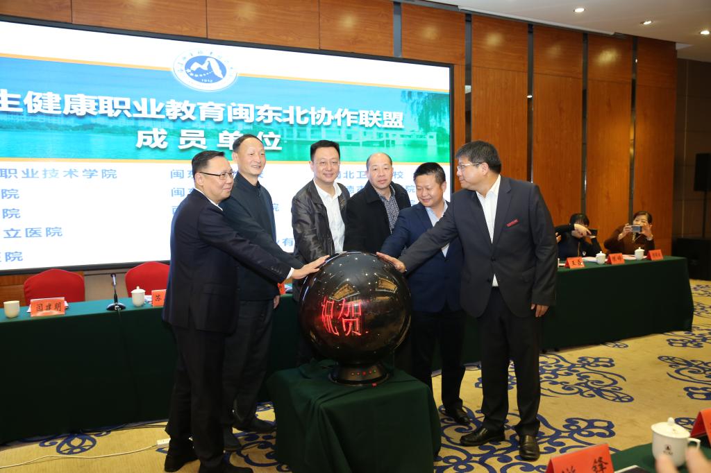 会上举行了卫生健康职业教育闽东北协作联盟成立仪式。洪涛处长、柳贵清会长、曾武祈书记、苏友新校长以及宁德市人民医院颜银斌副院长、邵武市立医院甘芝荣副院长共同按下联盟启动按钮,曾武祈书记为联盟理事单位代表颁发聘书。
