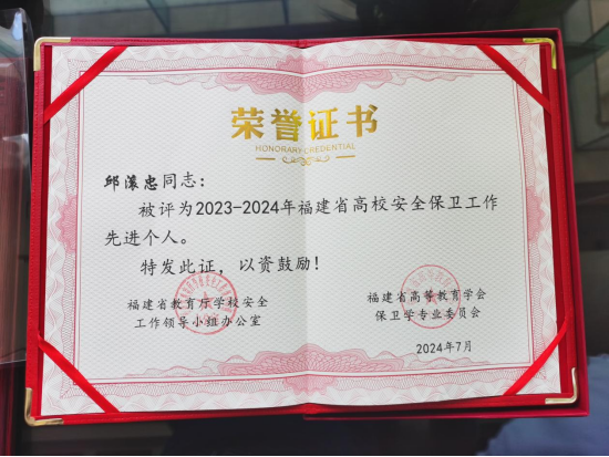 会上,福建省高等教育保卫学会还表彰了2023-2024年福建省高校安全保卫工作先进集体、先进个人。我校安全工作处荣获2023-2024年福建省高校安全保卫工作先进集体荣誉称号,邱滚忠同志荣获2023-2024年福建省高校安全保卫工作先进个人荣誉称号。
