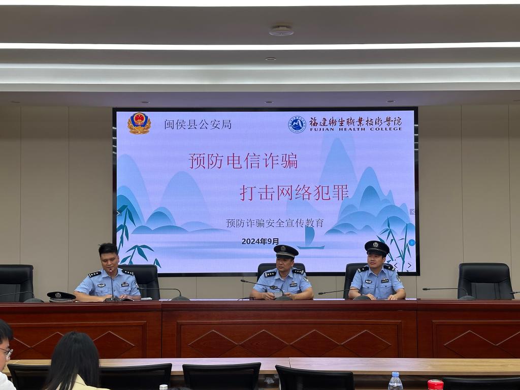 为提高我校学生的防诈骗意识,学校邀请闽侯县公安相关部门民警于9月10日上午,到校开展预防诈骗安全宣传教育工作及安装国家反诈中心APP培训会,全体专兼职辅导员参加会议。