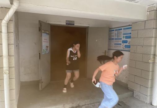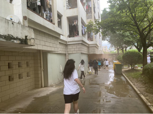 2月23日下午4:00时,全体演练工作人员到位,学生进入各自宿舍就位。为取得良好演练效果,我处工作人员点燃烟雾,模拟真实的地震火灾场景。演练开始,第一声哨响,全体学生均意识到突发灾难来临,立即在墙角及桌边蹲在躲避,5秒后第二声哨响,全体学生捂住口鼻,按照逃生路线有序的、迅速的逃离宿舍并撤离到安全区域。本次演练总共用时1分33秒,达到演练预期效果。