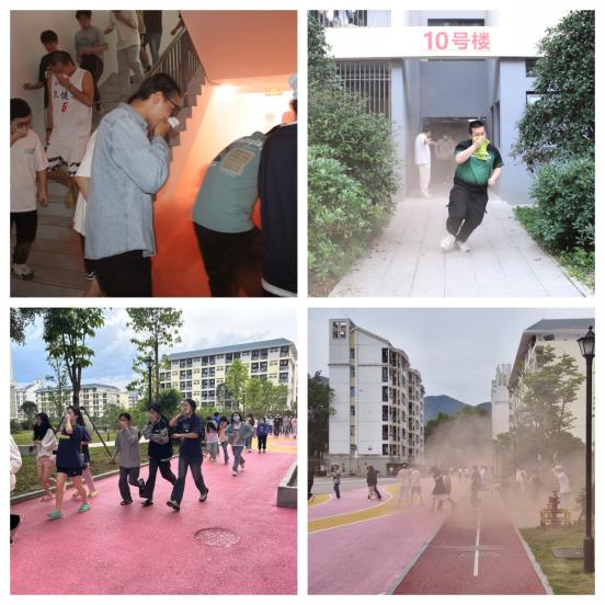 下午3:50,演练正式开始。为真实还原地震火灾的场景,工作人员在每个宿舍楼道点放演练用烟雾弹,模拟灾害现场烟尘弥漫、能见度低的恶劣环境,宿管员立即打开宿舍所有通道门禁,方便学生疏散。