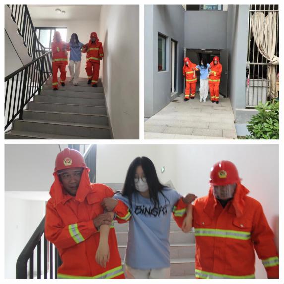 宿舍区第一声“地震火灾突发情况警报”响起,参演学生迅速找到室内安全三角区及承重柱(墙体突出部分),采取抱头、闭眼,下蹲姿势,靠在承重墙边,并尽量蜷曲身体,降低身体重心;5-10秒后,第二声“应急疏散信号”响起,参演学生用湿毛巾或衣服遮住口鼻,同时弯腰按疏散线路有秩序地进行撤离,行至指定集合点集中。