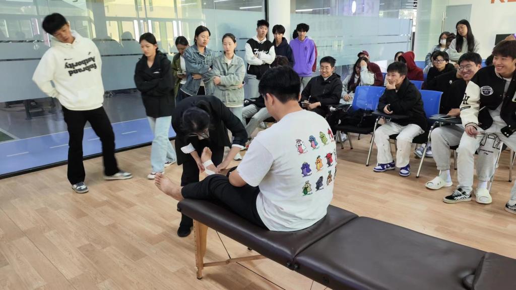 本次演练分为运动损伤处理演练和应急逃生演练(消防、地震)两个部分。运动损伤处理处理演练由健康学院温晓黛老师、魏涵锐老师现场讲授运动损伤的应急处理流程,并现场进行模拟处置。