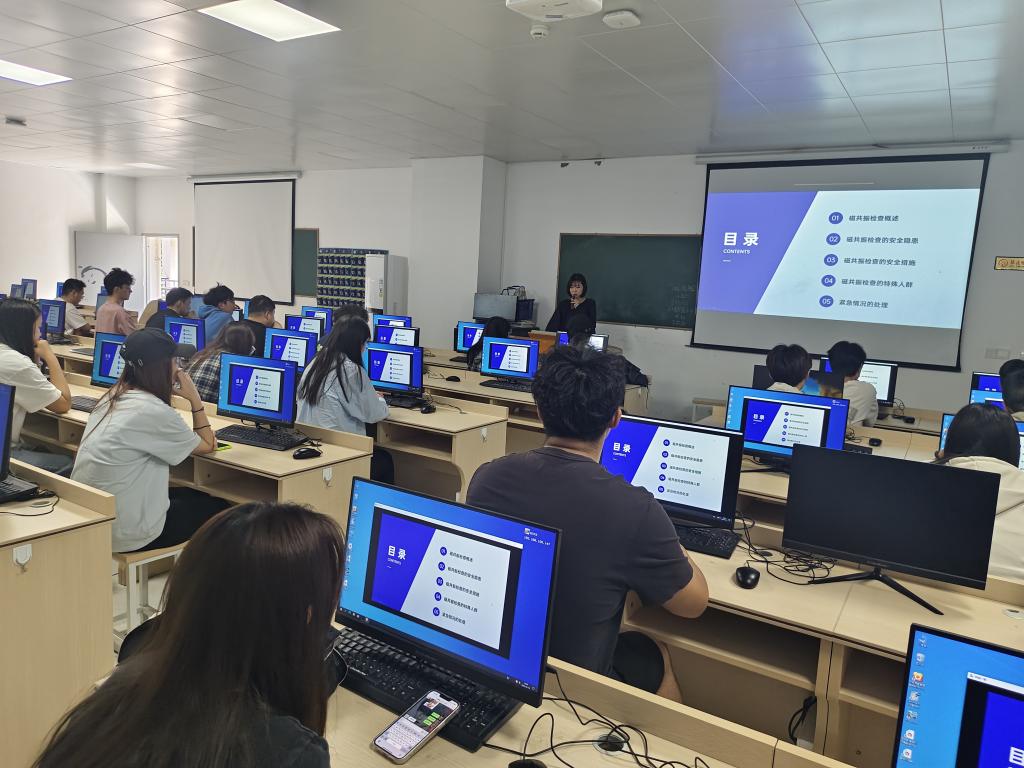 为保证演练活动安全、有序进行,工作人员事先进行周密安排,制定演练方案。本次演练分两个部分进行。第一部分,磁共振MRI检查安全演练。首先由医学技术与工程学院吴沁老师集中讲授实训过程中磁共振MRI检查安全、处理流程及预防措施。告知学生发生MRI检查意外不要惊慌,听从指挥,完成应急处理流程。工作人员维持现场秩序,确保实训室无发生其他安全事件。