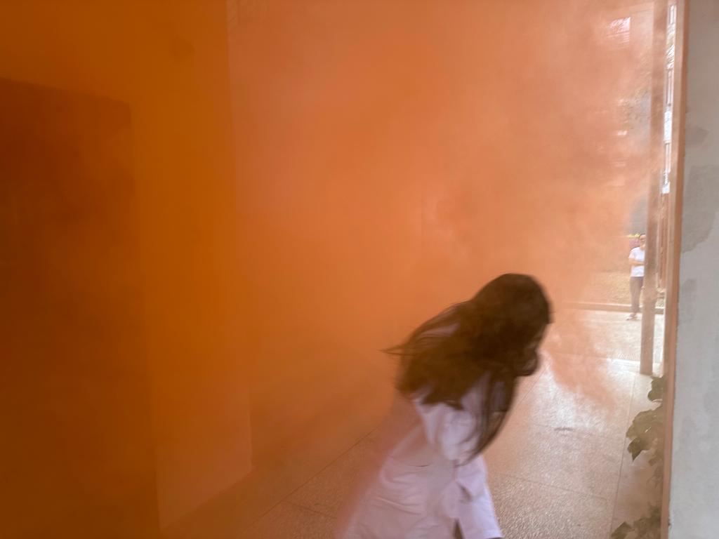 第二部分应急逃生演练(消防、地震)。演练开启前安全工作处林泽文先详细介绍消防器材的使用、演练程序、疏散信号、疏散路线、疏散顺序等注意事项,并强调在疏散过程中切勿拥挤、推搡导致踩踏事件发生。各位置工作人员提前到岗,认真履责,确保撤离安全有序。演练开始,安全工作处演练工作组接到演练指令后,模拟燃放烟雾,工作人员组织学生依次从实训(验)室撤出,按照指定路线,分别有序从楼梯通道内侧撤离,做到弯腰、捂口鼻、迅速有序,到一层大厅集合并清点人数。