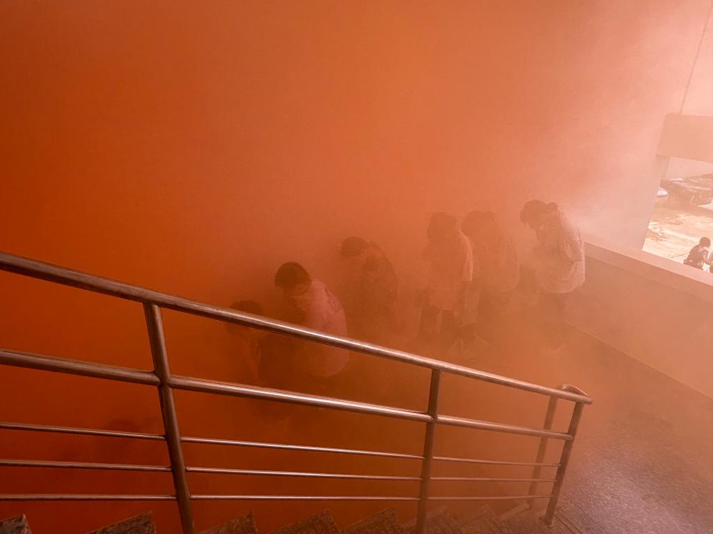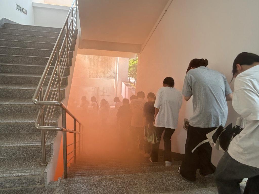第二部分应急逃生演练(消防、地震)。演练开启前安全工作处林泽文先详细介绍消防器材的使用、演练程序、疏散信号、疏散路线、疏散顺序等注意事项,并强调在疏散过程中切勿拥挤、推搡导致踩踏事件发生。各位置工作人员提前到岗,认真履责,确保撤离安全有序。演练开始,安全工作处演练工作组接到演练指令后,模拟燃放烟雾,工作人员组织学生依次从实训(验)室撤出,按照指定路线,分别有序从楼梯通道内侧撤离,做到弯腰、捂口鼻、迅速有序,到一层大厅集合并清点人数。