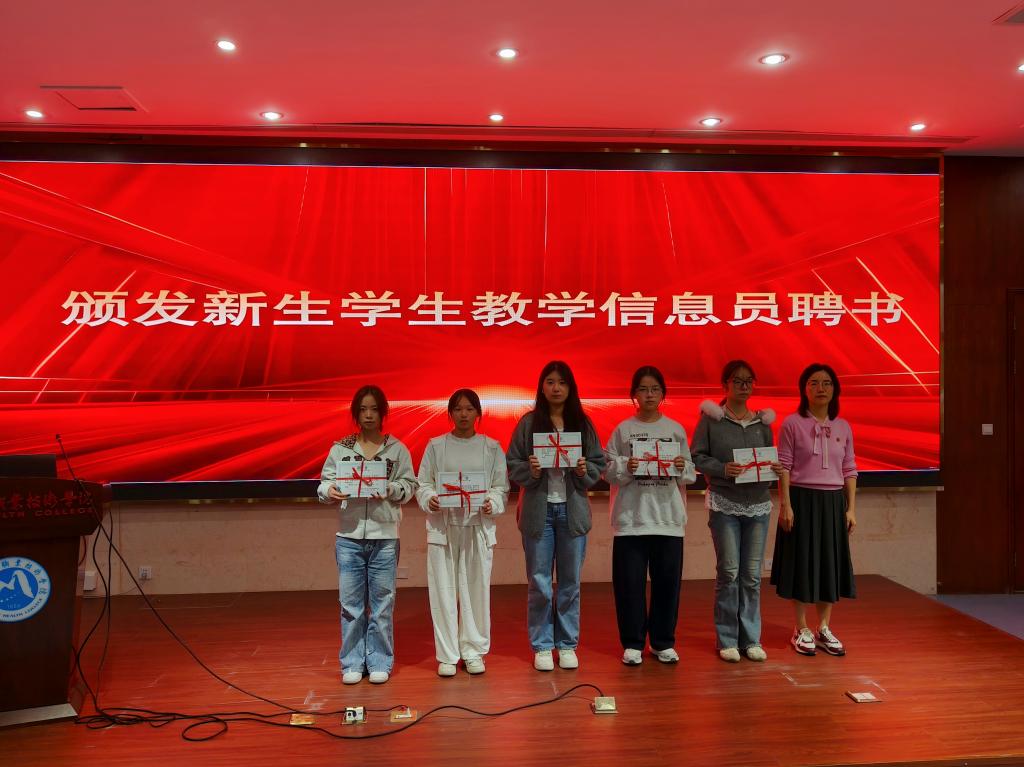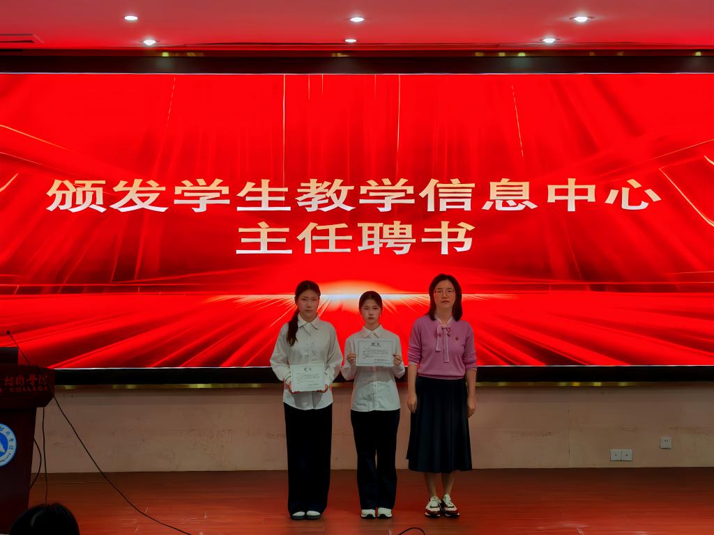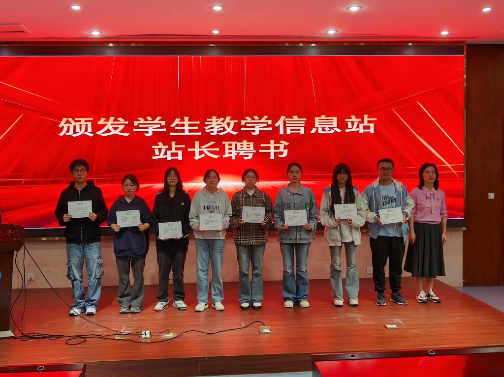 在聘任环节,李燕平副主任依次为新任学生教学信息中心主任、各学生教学信息站站长颁发聘书,并为新生教学信息员代表授聘。新生教学信息员25卫管303班林可涵同学代表现场作表态发言,表达了认真履行职责、主动反馈教学情况、服务师生教学需求的决心。