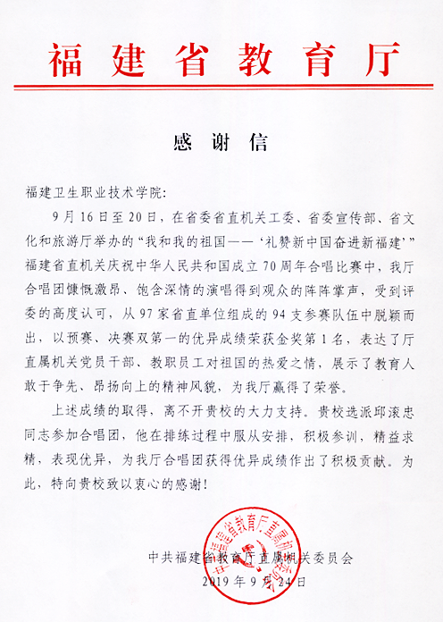 近日,我院收到了来自中共福建省教育厅直属机关委员会的感谢信,感谢我院的邱滚忠同志。