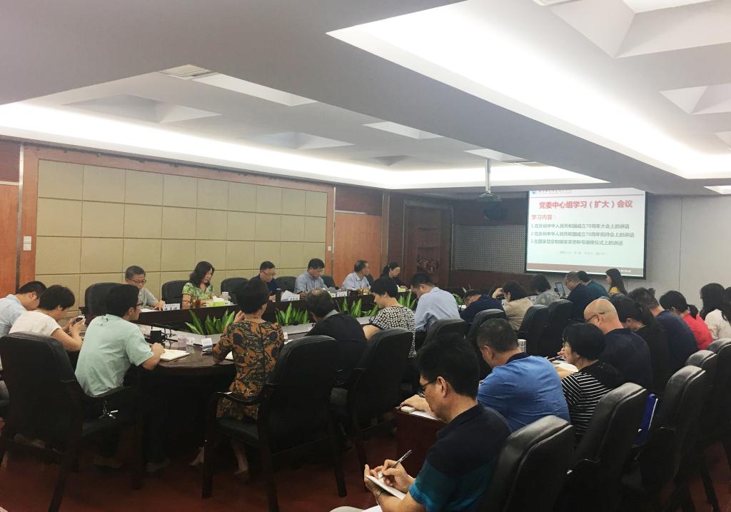 10月9日下午,党委书记曾武祈主持召开党委中心组学习(扩大)会议,学习《习近平2019年9月29日在国家勋章和国家荣誉称号颁授仪式上的讲话》《习近平在庆祝中华人民共和国成立70周年招待会上的讲话》和《习近平2019年10月1日在庆祝中华人民共和国成立70周年大会上的讲话》。参加会议的有院领导及全体中层干部共50余人。