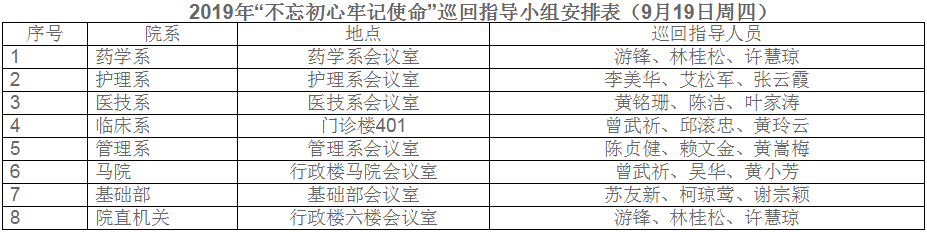 919日下午,福建卫生职业技术学院党委派出7个巡回指导小组,分别参加各党总支(直属党支部)组织召开的“不忘初心、牢记使命”主题教育动员部署会。