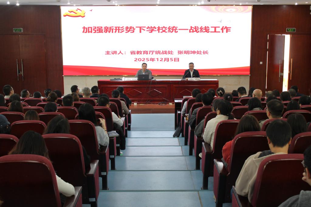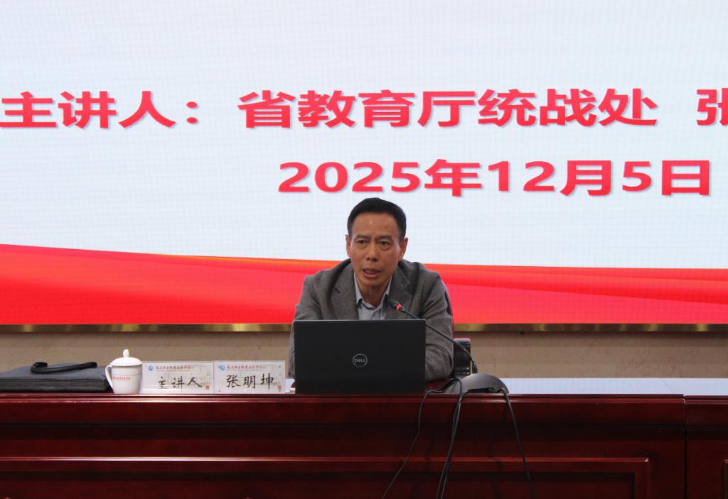为深入学习领会党的二十届四中全会精神,进一步提升统一战线工作队伍的政治站位和理论水平,12月5日,我校联合中共闽侯县委统战部(民宗局)、福建艺术职业学院、福州英华职业学院、大中小思政一体化建设联盟等12家单位共同举办“加强新形势下学校统一战线工作”专题培训会。本次培训特邀省教育厅统战处处长张明坤授课,旨在深化思想认识、凝聚实践合力,推动新时代统一战线工作高质量发展。讲座由我校党委书记曾武祈主持。
