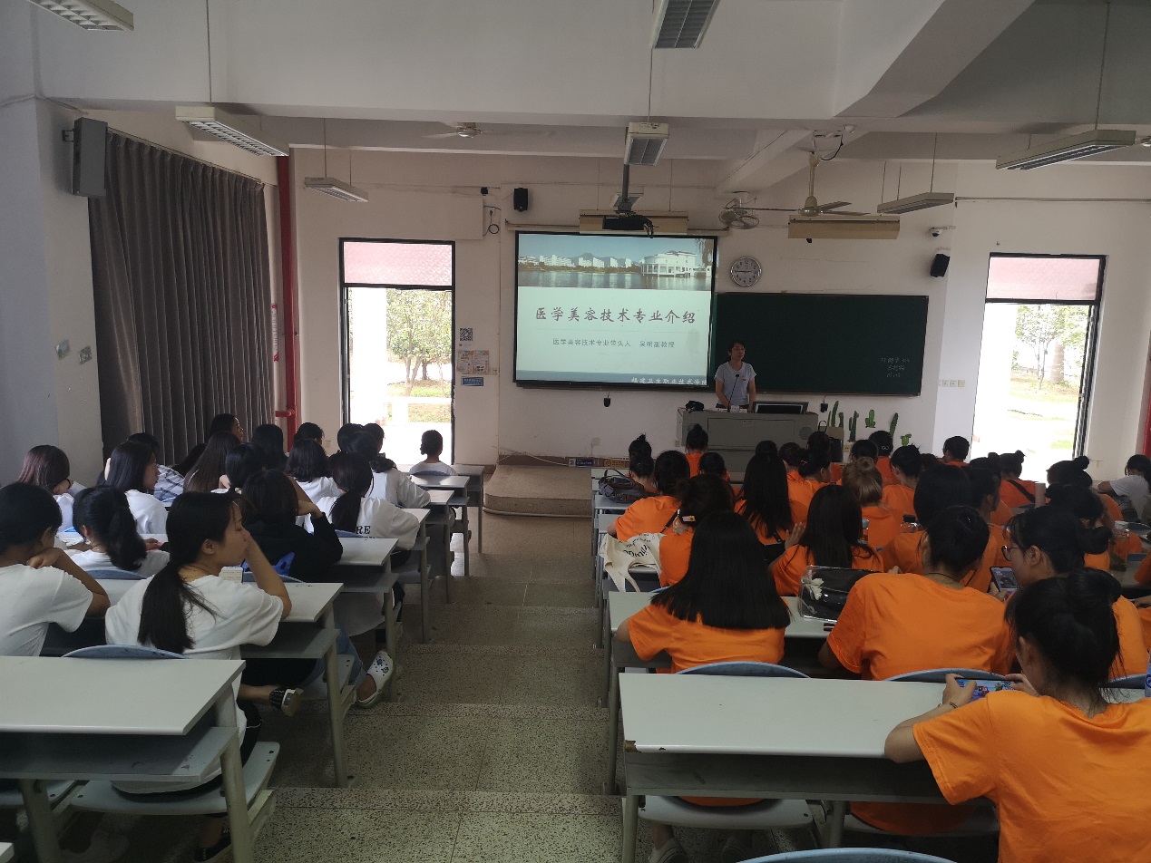 2019年10月17日下午,为了提升高职一年级新生对自己所学专业的了解,我校医学美容技术专业学科带头人吴明老师给2019级医学美容技术专业新生进行专业介绍,同时参会的还有医学美容与中医养生教研室主任杨笑老师和专任教师李芳琴老师。吴明老师主要从专业简介、培养目标、课程设置、师资力量、就业方向、可考取的资格证以及历届医学美容技术专业获奖情况等方面介绍了医学美容技术专业,详细说明了专业的发展特色与方向。吴明老师对新生们提出几点希望:希望同学们在学习期间,能有坚定的理想信念,努力把专业课程学好,夯实基础;同时希望同学们能在未来的学习生活中积极参加专业相关的比赛,努力成为技术精湛的高技术人才。最后的答疑解惑环节,同学们积极地提出对未来学习方向的问题和见解。