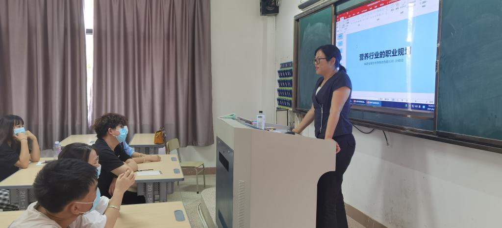 金草堂的孙总则从企业用人的角度,给大家进行了营养行业的职业规划给出了恳切的建议。孙总的分享了自己的人生经历、用切实的案例教会大家如何平衡兴趣和专业,并提到了企业最看重员工的能力及品质。此外,孙总还在如何利用课余、寒暑假时间去挖掘自己的能力潜力等方面给了极具操作空间的建议。最后,孙总鼓励同学们能在今后的就业中能够不局限于自己所想,开拓创新,面向社会更好的宣传创新,把营养推进千家万户!