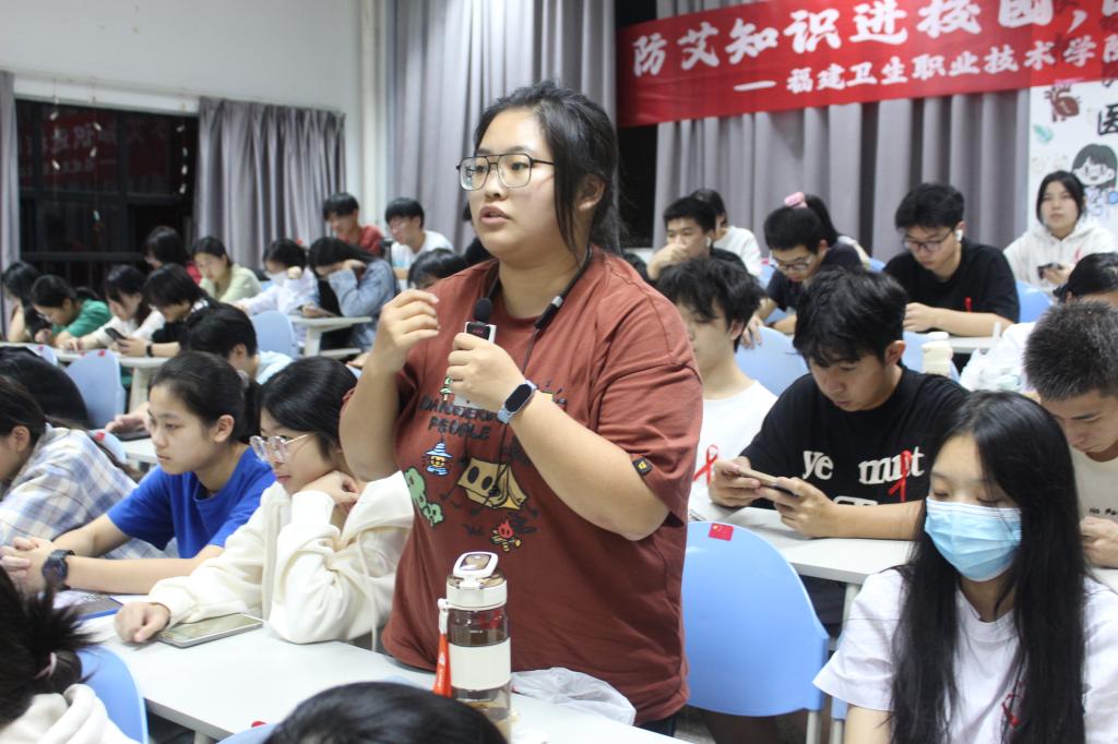 为了增强讲座的互动性和实效性,潘主任特意设置了问答环节。这一环节激发了现场同学们的浓厚兴趣,大家纷纷举手提问,潘蕴蛟就艾滋病的传播途径、检测方法、疫苗研发等问题为同学们一一解答,消除了大家的疑虑和困惑,使大家对防艾知识有了更加深入的了解。
