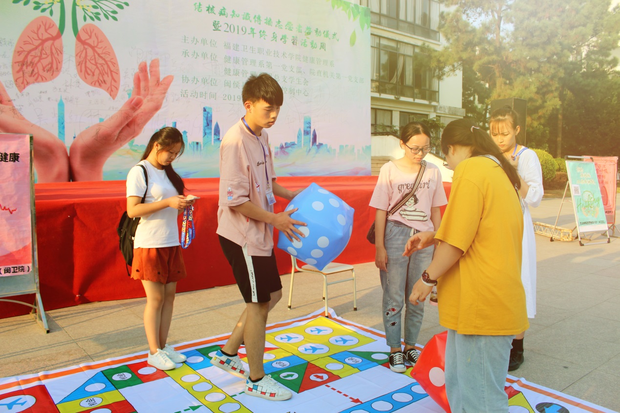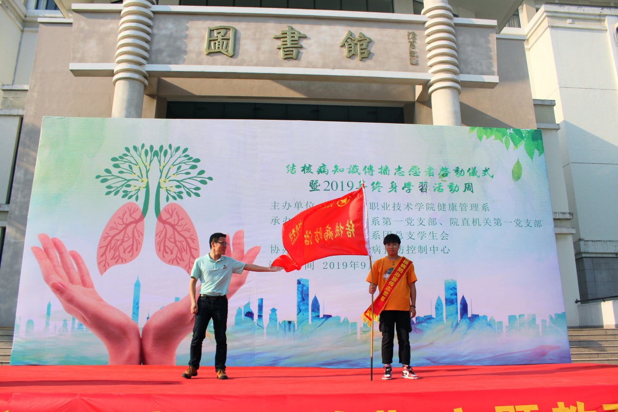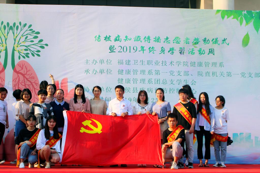 2019年9月25日,由健康管理系主办,管理系第一党支部、院直机关第一党支部、健康管理系团总支承办的“志愿者结核病防治知识传播启动仪式暨2019年终身学习活动周”在福建卫生职业技术学院图书馆广场举行。此次活动是根据福建省终身教育促进委员会关于开展2019年“9•28终身教育活动日”暨全民终身学习活动周的通知精神并响应福建省卫生计生委推动结核病防治知识传播活动的号召,在学校组建结核病防治宣传活动志愿团队,发挥学生专业技能,推进健康中国建设,大力提高国民素质,并提高学生为人群健康服务的意识和决心。活动得到了闽侯县CDC的大力支持,闽侯县疾控中心江仁衔主任、福建省疾病预防控制中心黄智忠副主任医师、院团委黄曦书记、健康管理系党政负责人等参加活动。