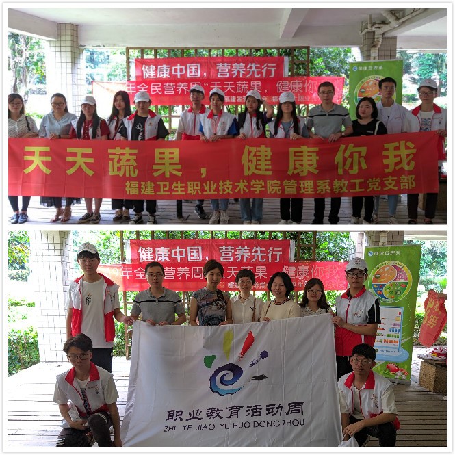 为进一步贯彻落实党的十九大精神,宣传和展示职业教育成果,响应“健康中国”战略,落实以人民健康为中心,坚持以基层为重点,以改革创新为动力,助力推进健康中国建设,促进全民营养,提高全民健康水平。5月17日,管理系教工党支部联合医学营养教研室前往晋安区幸福城小区,开展“天天果蔬,健康你我”职教体验活动。管理系教工党支部书记冯瑞华、组织委员王国浩,教师党员代表吴晶、李芳琴,医学营养专业带头人徐轶彦,医学营养教研室教师蔡丹凤以及17、18级医学营养专业学生参加了此次活动。