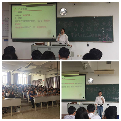 为及时落实同学们阶段性思想汇报情况,端正入党动机,加强党性修养, 2019年4月10日,管理系第五期业余分党校第五课于教学楼209开讲。本期分党校培训班由管理系学生党支部组织委员李丹老师作为主讲人,开展本次“入党积极分子思想汇报书写格式及要求”的专题讲座,分党校全体学员到场聆听。