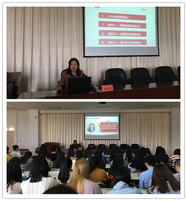 日下午,学院纪委李美华书记在行政楼六楼为健康管理系党员、入党积极分子讲授以“新时代 新青年”为主题的学习党的十九大精神专题党课。