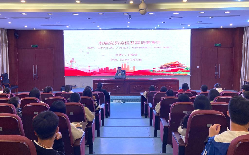 为使入党积极分子更加了解中国共产党党员发展流程及其培养考察的内容,2021年12月12日晚上健康管理系业余分党校第八期培训班暨青马工程培训班第二课在实训楼四楼报告厅举行。本次授课由健康管理系专职组织员许晓湖主讲,为同学们带来了一次精彩生动的党课。