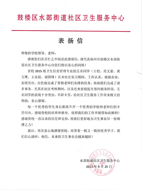 近日,管理系收到实习单位水部街道社区卫生服务中心发来的表扬信。