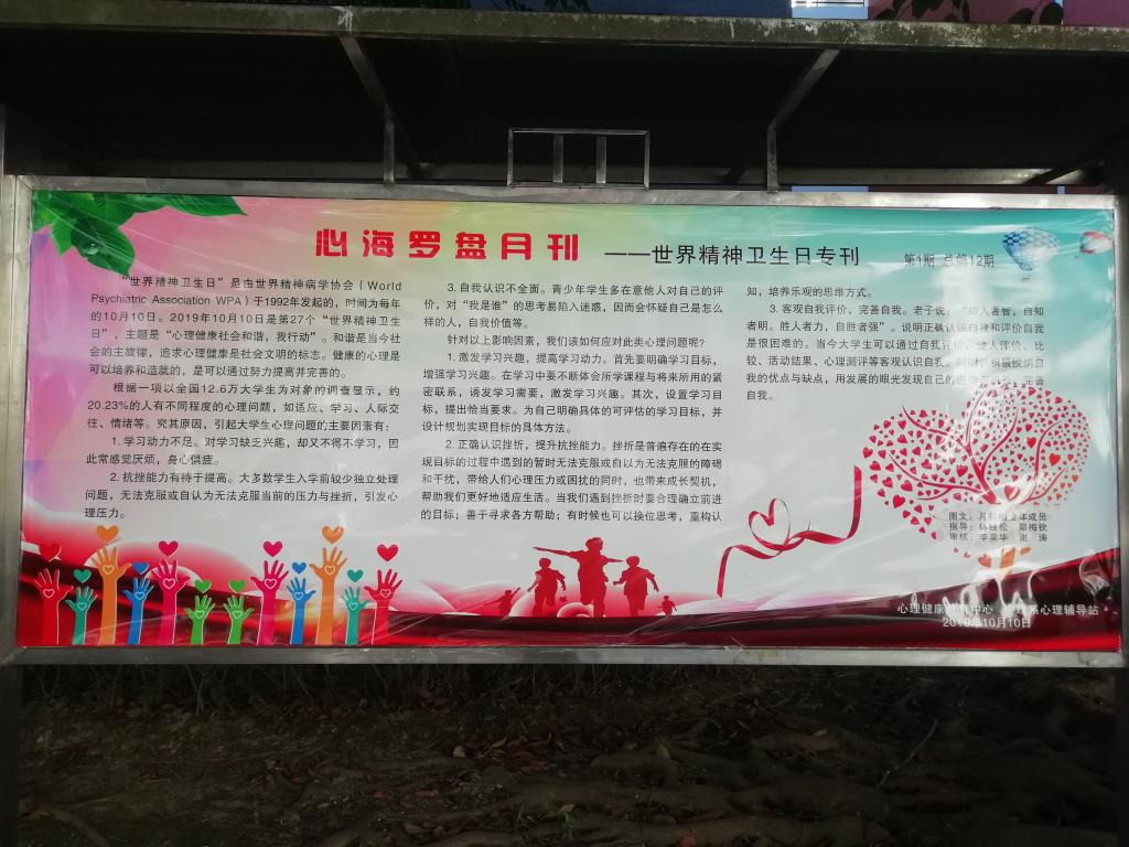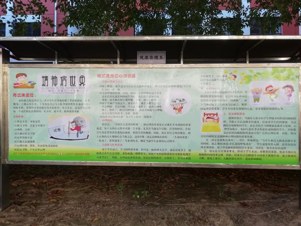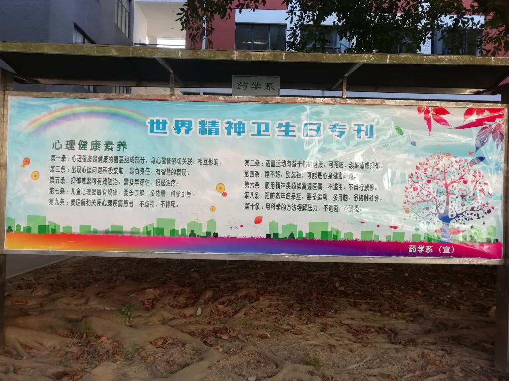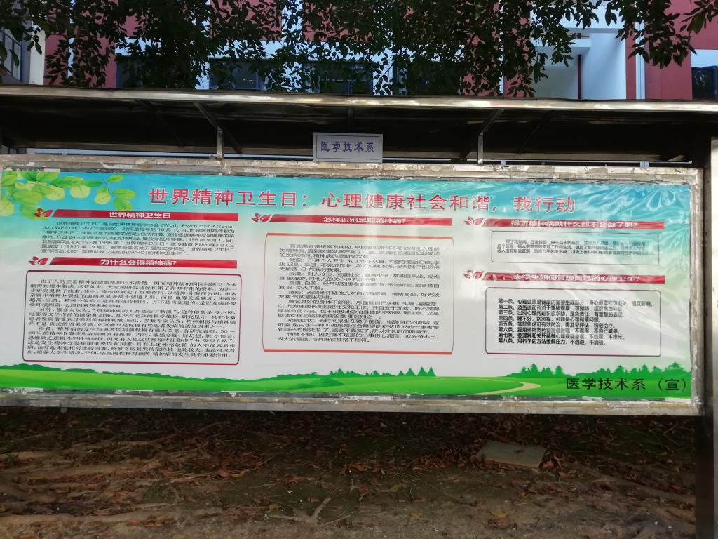心理健康教育中心以及各系部都出一期宣传栏和横幅,旨在大力普及和宣传第28个“世界精神卫生日”的主题。各系部在院心理中心的带领下,群策群力,积极认真,无论是宣传栏还是横幅标语,内容紧扣主题,结合大学生个性以及日常学习生活中常遇见的问题,表达通俗易懂,生动活泼,画面多彩清新,深受学生欢迎喜爱,也达到了借第28个“世界精神卫生日”,在全院制造重视精神卫生、心理卫生的浓厚氛围的效果。