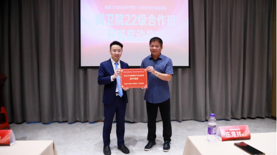 庄海林代表学校,对校企合作班的同学们表示祝贺,对爱美尔医疗门诊有限公司给予的大力支持表示感谢。并在教师节来临之际,代表学校为企业教师送上教师节活动经费。希冀同学们能珍惜这样的学习机会,增强未来在社