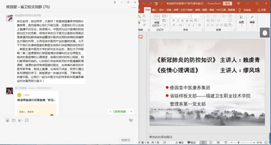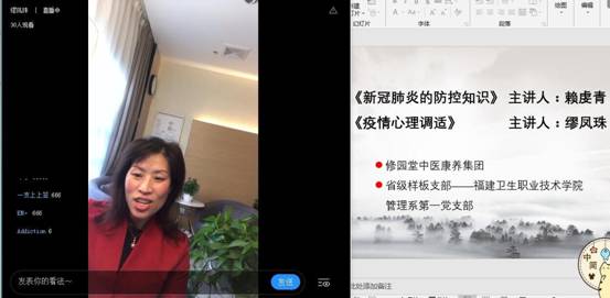 2月27日下午,福建卫生职业技术学院管理系第一党支部联合修园堂中医康养集团组织在线学习活动,为福建卫生职业技术学院2018级、2019级中医养生保健专业的师生讲解抗击疫情相关知识,共同为健康保驾护航。