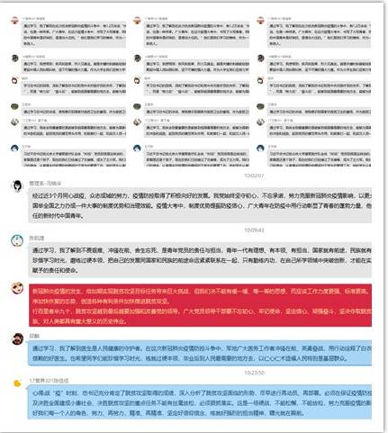 管理系第二党支部书记冯瑞华表示经过近2个月同心战疫,我党始终坚守初心,不忘承诺,努力克服新冠肺炎疫情影响,以更大的决心和更强的力度推进脱贫攻坚。广大青年在防疫中用行动彰显了青春的蓬勃力量,他们交出了合格的答卷,是好样的,是堪当大任的新时代中国青年。张凯捷老师表示作为一名辅导员,应劝勉同学们要珍惜学习时光,磨练过硬本领,把自己的发展同国家和民族的前途命运紧紧联系在一起。