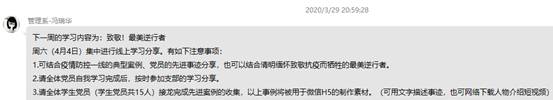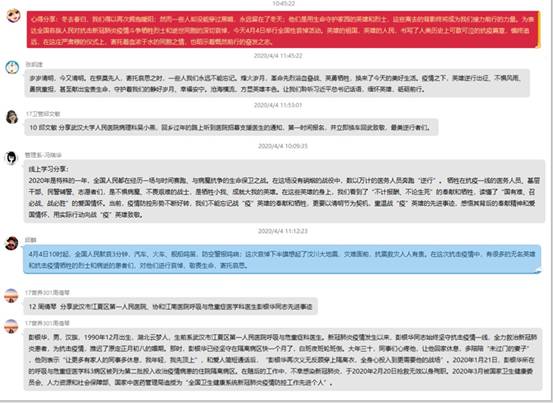 自主学习后,冯瑞华同志在支部QQ群中组织支部党员围绕学习内容纷纷发表学习感想。冯瑞华同志表示不能忘记战“疫”英雄的奉献和牺牲,以清明节为契机,重温战“疫”英雄的先进事迹,感悟其背后的奉献精神和爱国情怀,用实际行动向战“疫”英雄致敬。张眉芳同志表示英雄的祖国,英雄的人民,书写了人类历史上可歌可泣的抗疫篇章,慎终追远,在清明这一特殊时期,即寄托着血浓于水的同胞之情,也昭示着慨然前行的奋发之志。王国浩同志表示牺牲在第一线的医务工作者,警察,辅警及志愿者们,用自己的实际行动诠释了社会主义建设者的责任和担当,他们的先进事迹不会被历史所以往,必将激励更多的人为抗击疫情奉献自我。