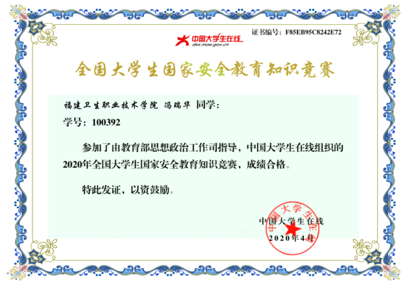 在认真学习了“2020同上一堂国家安全教育课”以后,广大师生党员,纷纷参与国家安全知识竞赛,并获得了·全国大学生国家安全教育知识竞赛证书。
