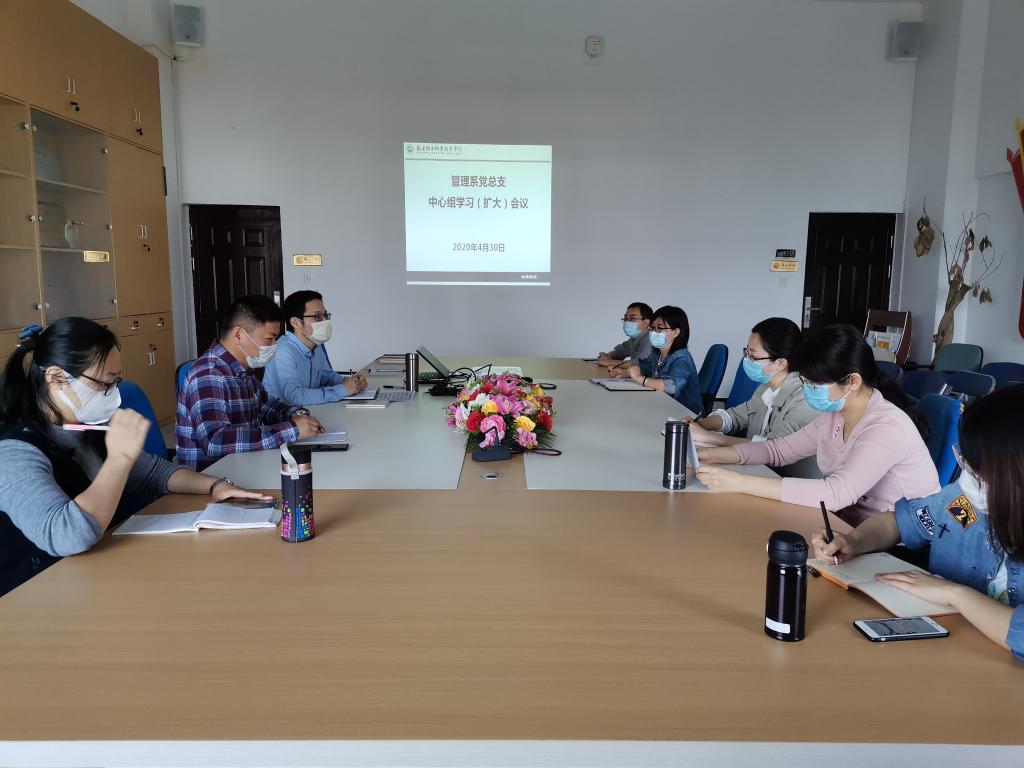 4月30日上午,管理系党总支召开中心组学习(扩大)会议,学习《党委(党组)落实全面从严治党主体责任规定》《关于新冠肺炎疫情期间暂停恢复大型体育活动和聚集性活动的通知》《关于继续加强科学精准防控积极做好复工复产复学人员健康管理工作的通知》《关于印发<教育系统应对学校突发新冠肺炎疫情处置预案>的通知》《关于做好重点人群管理服务等有关工作的通知》。会议由管理系党总支书记黄曦同志主持。