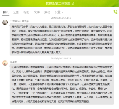 6月16日,管理系第二党支部组织学习党的十九届四中全会精神——中国制度十三讲中(第八讲):坚持和完善共建共治共享的社会治理制度。共建共治共享的社会治理制度,是我们党在长期探索中形成的、被实践证明符合国情、符合人民意愿、符合社会治理规律的科学制度,是习近平新时代中国特色社会主义思想的重要内容。党的十九届四中全会《决定》对坚持和完善共建共治共享的社会治理制度提出了明确要求,为新时代加强和创新社会治理指明了方向。