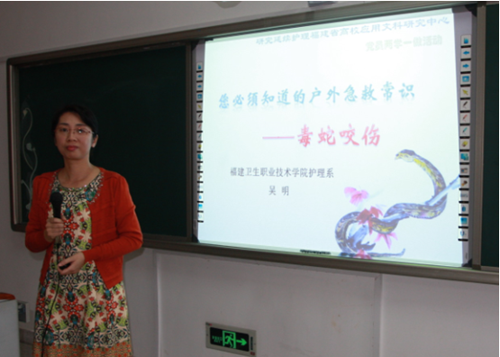 2016年10月13日上午,在护理系党总支的安排下,护理系第二党支部书记吴明老师前往福建省女子监狱举办一场关于蛇咬伤急救与处理的公益讲座。有一百多名的女监服刑人员和女监医护人员参加了此次讲座。