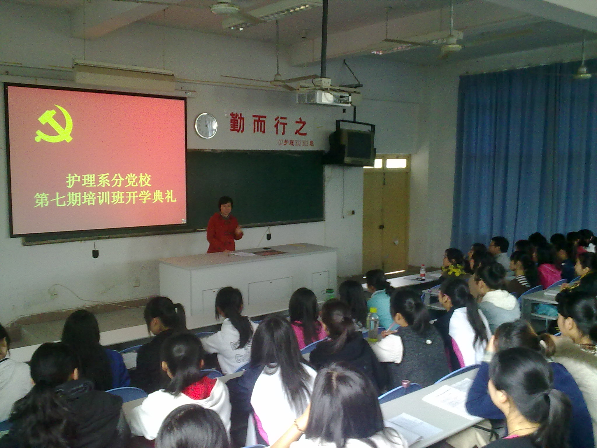 2011年5月4日下午,护理系分党校第七期学习班开班典礼在护理系第一阶梯教室举行。护理系党总支按照院党校的要求,做好入党积极分子的培养与组织发展,高度重视此次培训班的组织工作。我系党总支谢涛书记与各位辅导员出席了此次典礼。