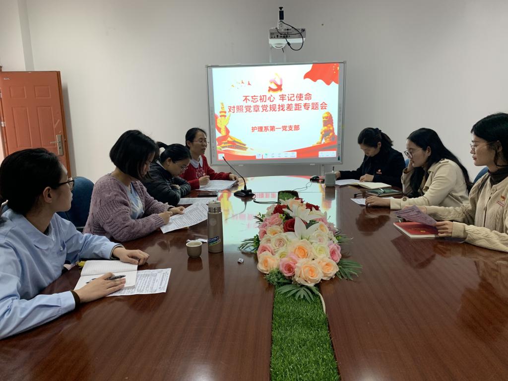 2019年11月28日,护理系第一党支部召开对照党章党规找差距专题会议,会议由支部书记贾箐箐同志主持。按照学院“不忘初心、牢记使命”主题教育工作安排与要求,支部党员认真学习贯彻习近平新时代中国特色社会主义思想,围绕“守初心、担使命,找差距、抓落实”的总要求,对照党章、《关于新形势下党内政治生活的若干准则》和《中国共产党纪律处分条例》,以正视问题的自觉和刀刃向内的勇气,逐一查找问题,真刀真枪解决问题。