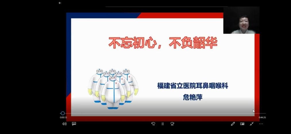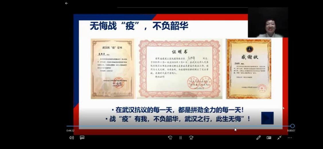 然后,危艳萍老师向大家分享了援鄂医疗队在战疫期间所救助病人的来信,“感谢福建省立医院医疗队的所有医护人员,这份深情厚谊让武汉人民永生难忘,是你们待病人如亲人,为我们加油鼓劲战胜疾病……”病人在信中表达了对医护人员满满的感激与敬意。危艳萍老师说,“在驰援武汉的48天里,我们有过欢乐与汗水,有过艰辛与收获。我们克服了重重困难,不忘医者初心,发挥党员的先锋模范作用,用南丁格尔精神,在大战中践行使命,在大考中交出合格答卷,我们只是尽了医护人员的职责与担当,如今我们平安归闽,但我们的心永远和武汉、和湖北连在一起!”