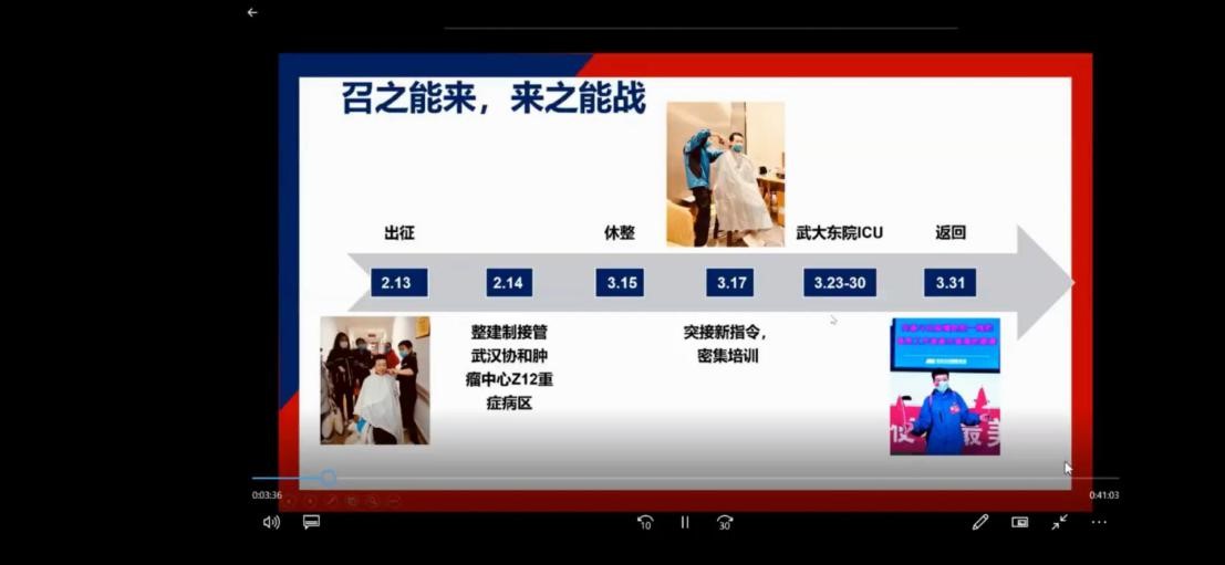 接着,危艳萍老师向大家生动细致的分享自己的“从战”经历,危艳萍老师2020年2月12日递交请战书,2月13日晚接到第二天就要出发武汉的通知,疫情就是命令,防控就是责任,危艳萍老师和众多医护工作者一样,毫不犹豫的踏上奔赴武汉的战场。刚到武汉时,防护物资还很紧张,没有靴套就用医疗垃圾袋,外科手套不足就用检查手套,到后来防护物资才逐渐充裕。令危艳萍老师最难忘的还是穿着防护服每天工作7、8个小时,衣服干了又湿,湿了又干。防护口罩勒的耳朵感觉快要掉了,护目镜压得鼻梁、颧骨持续疼痛,厚厚的防护服闷得她喘不上气。那些平时简单轻松就能完成的工作变得困难重重,干什么都有费力感。人也容易疲劳,有一次蹲下休息,差点站不起来,但忙起来所有的不适也就忘了。
