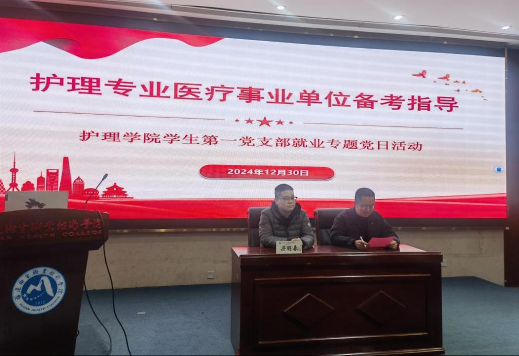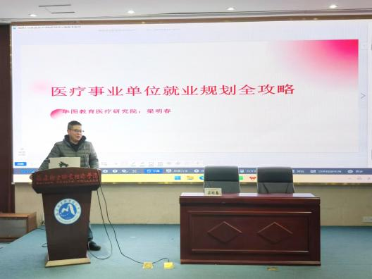 为深入贯彻党的二十届三中全会和全国教育大会精神,贯彻落实党中央、国务院对高校毕业生就业创业工作的决策部署,帮助学生提升职业素养和就业竞争力,护理学院学生第一党支部于12月30日晚在实训楼报告厅开展就业指导党日活动。本次活动特邀华图教育医疗研究院梁明春老师作《医疗事业单位就业规划全攻略》专题辅导。护理学院2025届毕业生线上参加此次活动。