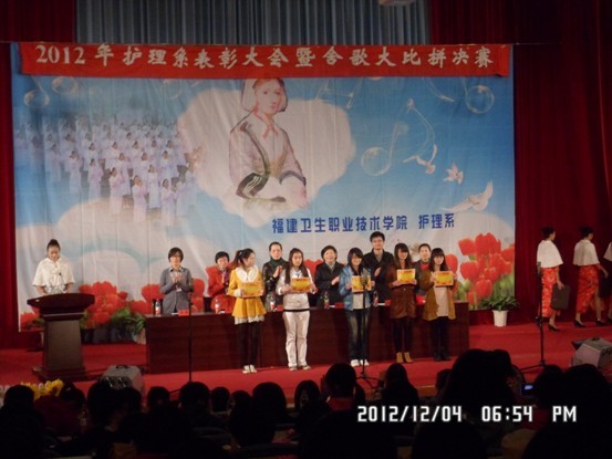 2012年12月4日晚6:30,福建卫生职业技术学院护理系团总支、学生会在学术厅共同举办2012年护理系表彰大会暨第三届舍歌大比拼决赛。莅临本次活动的领导及嘉宾有学院魏立娜副院长、护理系郑翠红主任、护理系党总支谢涛书记、院团委宋维副书记、院团委董东老师、护理系团总支书记林媛老师、各系团总支负责人及护理系全体辅导员。大会对先进集体、先进个人进行了表彰,魏副院长的讲话充分肯定了同学们获得的成绩,并对全系师生寄予厚望。