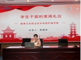 陈梅钦老师在提升学生干部素质和能力上,提出“1+2+3+4+5”新时代学生干部模式,希望学生干部时刻保持为同学全心全意服务的初心,以身作则,树立良好榜样。另外,陈梅钦老师针对学生干部常用礼仪,强调学生干部应加强言语表达、规范待人接物礼仪、会议礼仪等,希望在未来成长道路上,展现良好的形象和素养,树立正确的价值观和行为准则。