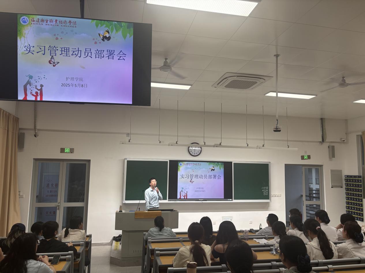为加强学生实习业务指导和日常教育管理工作,帮助学生顺利完成实习任务,5月8日晚,护理学院在学院第五阶梯教室召开2023级护理、助产专业学生实习动员部署会。护理学院党委书记林颖峰、副书记林来元、副院长林浩、2023级辅导员、各实习单位队长及副队长、省外自主实习学生共150余人参加了此次会议。