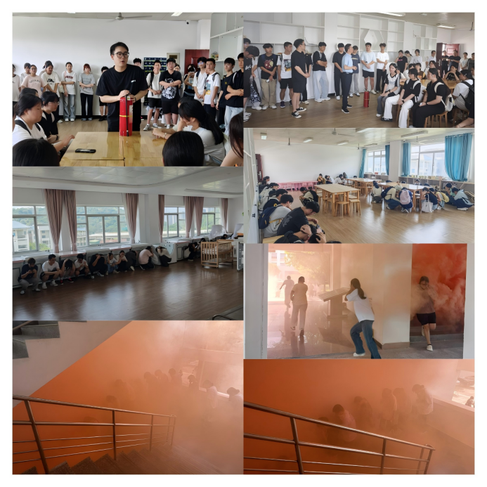 应急逃生演练(消防、地震)前,由安全工作处林泽文老师讲授注意事项和疏散路线,提醒学生听从指挥、有序撤离,防止出现拥挤、踩踏事故;各位置工作人员提前到岗,认真履职,确保撤离安全有序。演练开始,安全工作处演练工作组接到演练指令后,模拟燃放烟雾,工作人员组织学生依次从实训室撤出,按照指定路线,分别有序从楼梯通道内侧撤离,做到弯腰、捂口鼻、迅速有序,到一层大厅集合并清点人数。