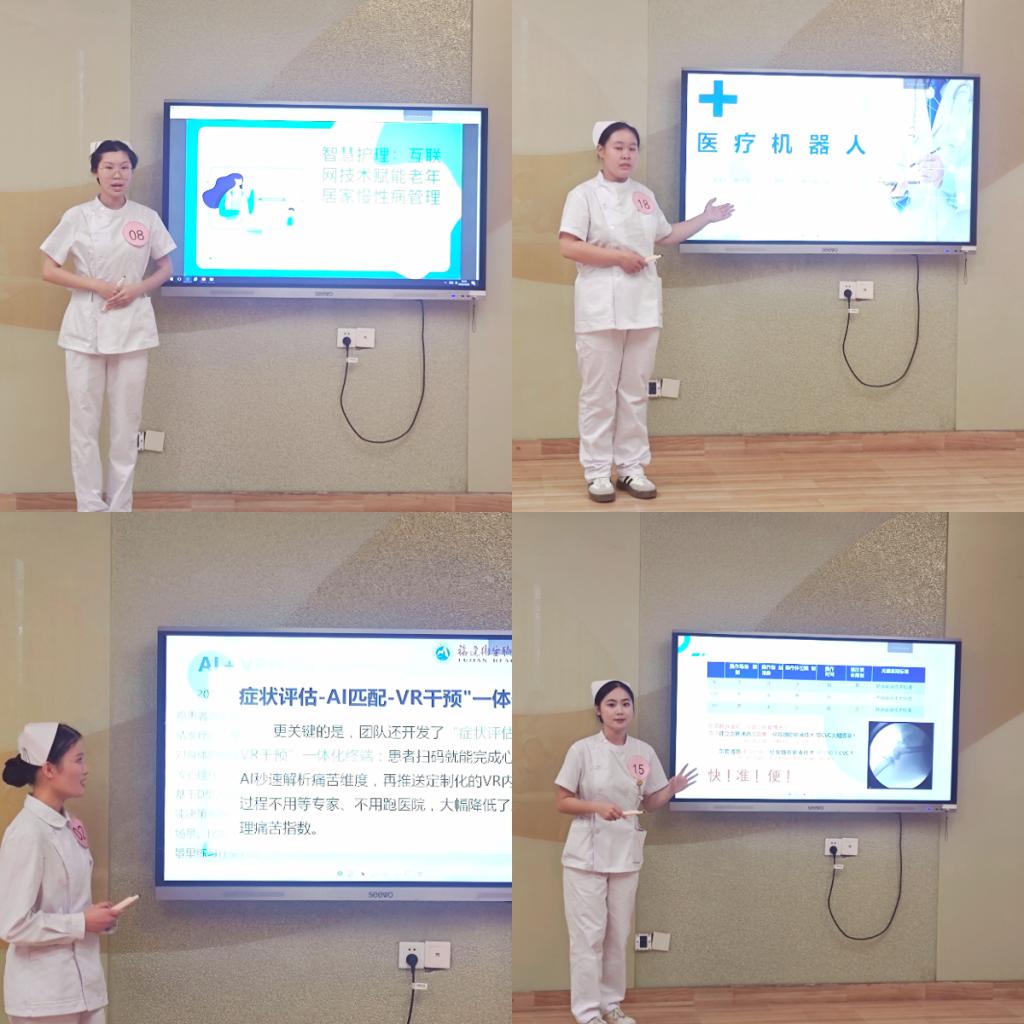 主题汇报环节中,选手们围绕“VR技术在护理实训中的应用”、“AI赋能老年照护”等自选主题展开阐述,结合传统护理理念与技术发展趋势,展现出良好的学科交叉意识与创新思维。汇报内容结构清晰、数据详实,表达流畅自信,充分体现了我院护生扎实的专业基础与开阔的职业视野。
