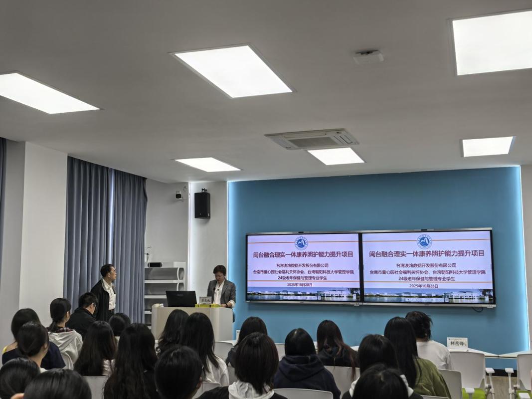同时双方就闽台融合理实一体康养照护能力提升项目及闽台融合实训基地建设也进行充分的研讨交流。肖春秀表示,将进一步推进闽台资源整合,借鉴台湾优质实训课程体系,进一步联合开发康养照护实训项目,探索“校企联动”的人才培养新模式。