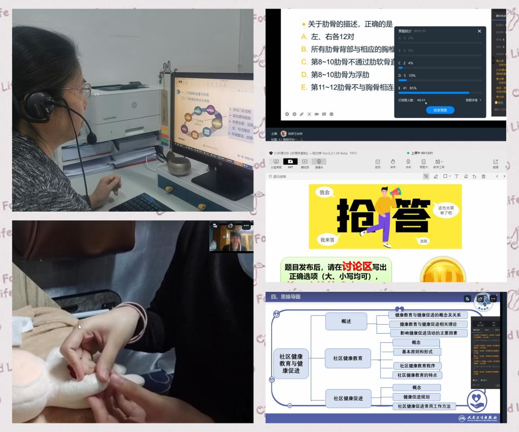 受疫情的影响,学校暂停线下教学,开启了将近一个月的线上授课。线上教学成为护理学院师生传送知识、交流情感的纽带。老师们结合课程特点和线上经验,积极调整教学方式和方法,一方面保证在“没有眼神交流”的情况下尽量将知识点讲透,还要辅以练习确保学生尽可能地掌握课程内容;另一方面,结合网课的特点合理有效设计PPT、互动环节、休息时间等,让网课更加有“现场感”,同时又让学生感受到老师的关心关爱,让网课更加有“温度”。