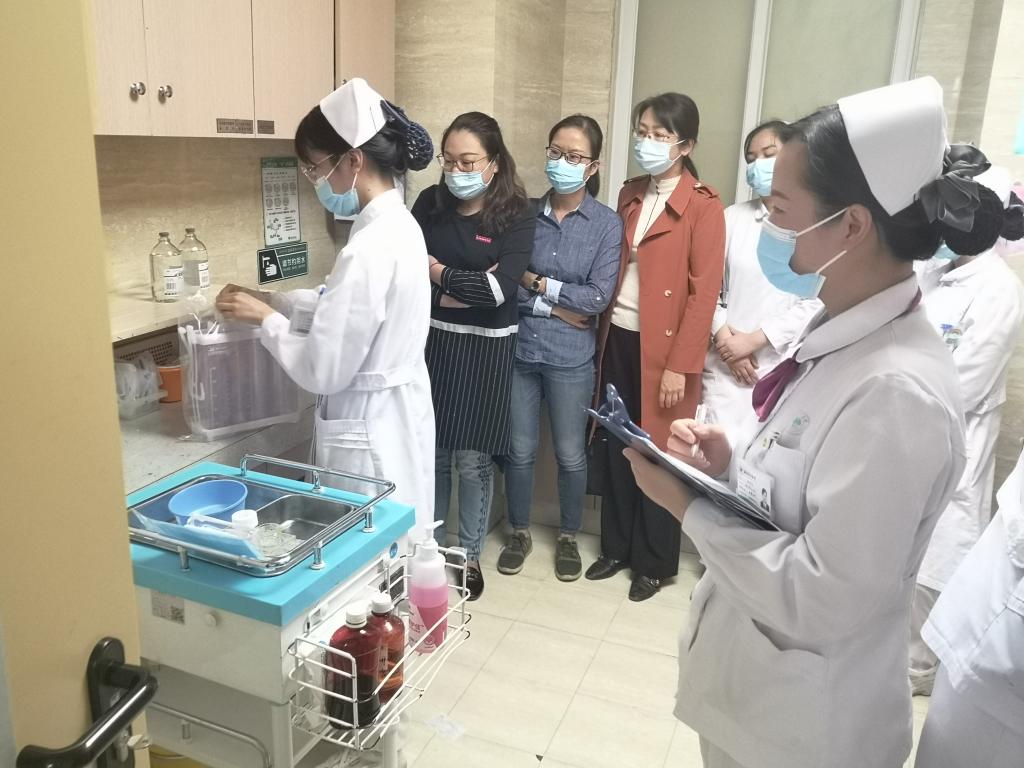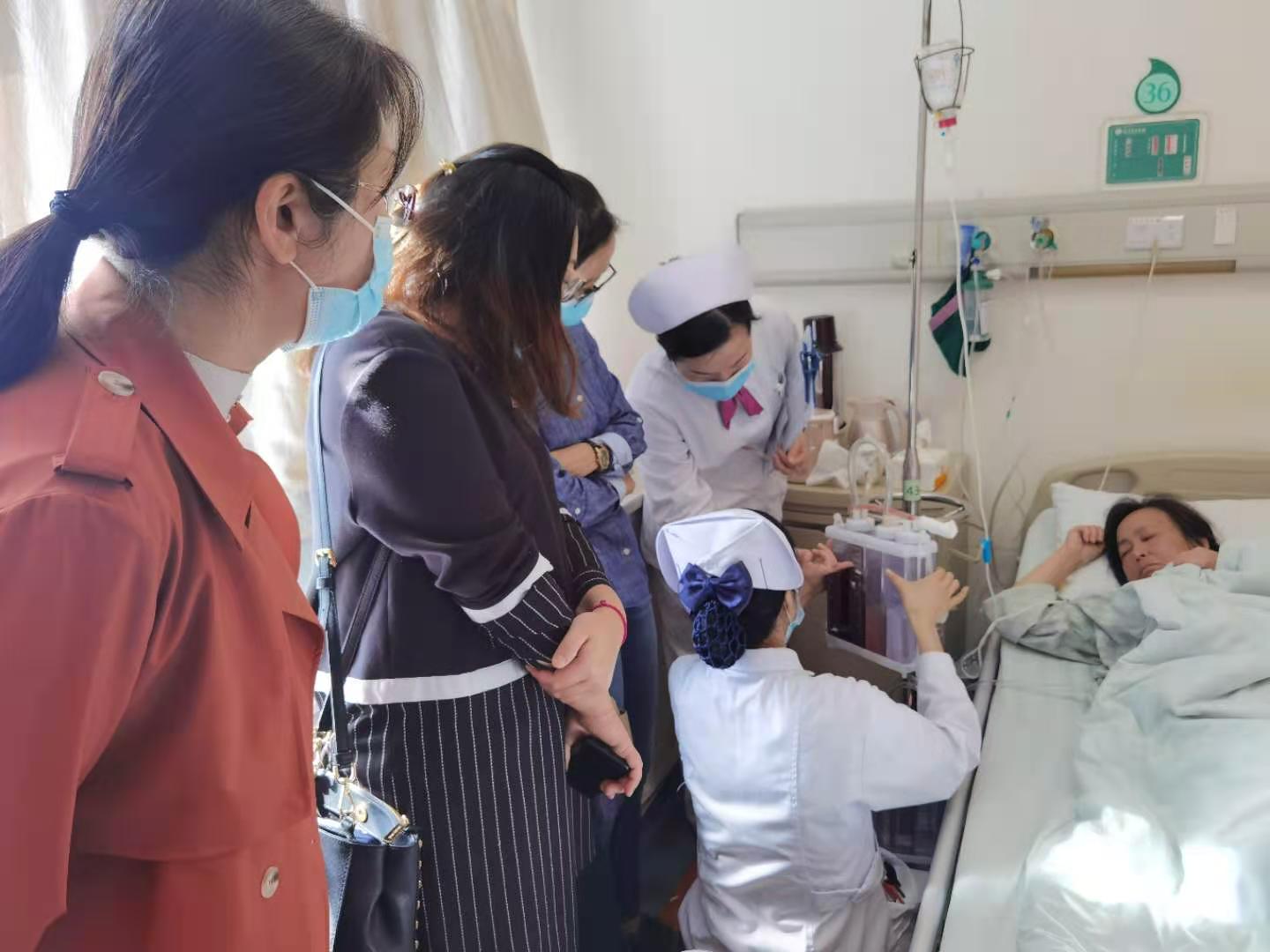 随后,老师们来到胸外科病区参与我院实习生的出科考核。考核项目为“胸腔闭式引流瓶更换”,该项操作是胸外科实习生出科技能考核的重点考查内容。学生们操作熟练、动作规范,操作过程中耐心地对患者进行人文关怀与健康指导,得到了总带教涂秀华老师的好评。