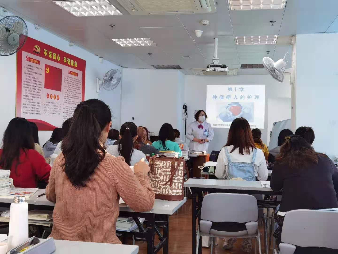 2020年11月13日,护理学院外科护理教研室主任吴明携骨干教师范飞、宋亦男在省立医院外科护理课程负责人涂秀华老师的陪同下,对校企合作班《成人护理-外科护理》课程进行了督导听课。老师们认真听取了省立医院蔡菲莉护士长的《肿瘤病人的护理》的授课,并进行了深入的探讨与交流。蔡菲莉老师课前准备充分,以生动、丰富的临床案例贯穿教学,激发学生的学习兴趣,并与学生们进行良好的互动,课堂秩序好、气氛活跃。老师们也对蔡菲莉老师提出了“将思政元素融入临床案例,让专业课发挥课程思政育人效应”的建议,并对教案的规范书写做了指导。