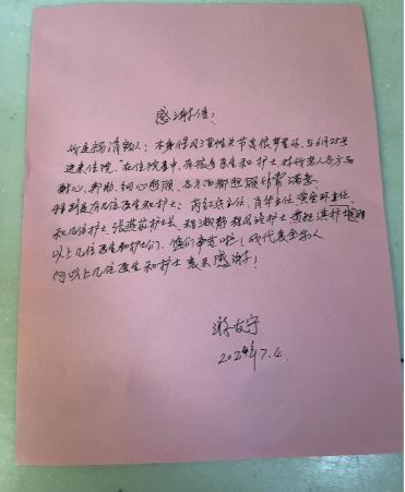 近日,护理学院22护理315班黄钰淇同学,在福建医科大学附属第一医院43区综合病区实习期间,收到了住院患者亲笔书写的感谢信。护理部及科室护士长也对该同学给予高度赞扬。