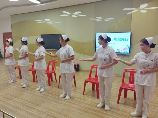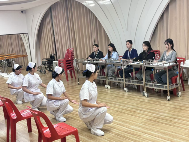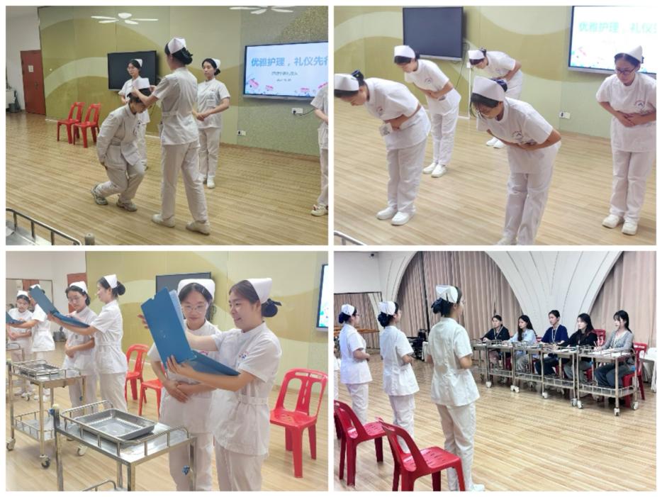 比赛现场,各队伍依次进行自我介绍,护理礼仪展示,内容包括仪容仪表、站姿、坐姿、行姿、蹲姿、洗手、端治疗盘、持病历夹、推车行进、拾拣物品、陪同引导、沟通技巧等护理工作中的各个环节。每个环节都展示着护理学子的礼仪风范。