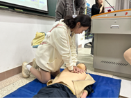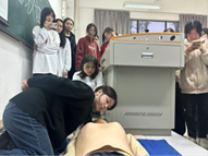 心肺复苏(CPR)这一环节更是重中之重。红十字会成员们先以通俗易懂的话术拆解操作流程:判断意识、胸外按压、开放气道、人工呼吸,每个动作的力度、频率都严苛讲究。为让同学们亲身体验,模拟假人与急救设备齐齐上阵。同学们初次上手略显紧张,按压深度不足、吹气节奏紊乱,成员们便一对一指导,耐心地手把手纠正,直到操作规范为止。